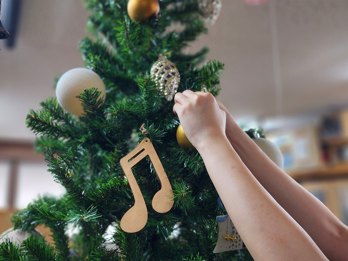 オーナメントは、大きなものや目立つものから、ツリーの上部からジグザグに、等間隔で配置します。