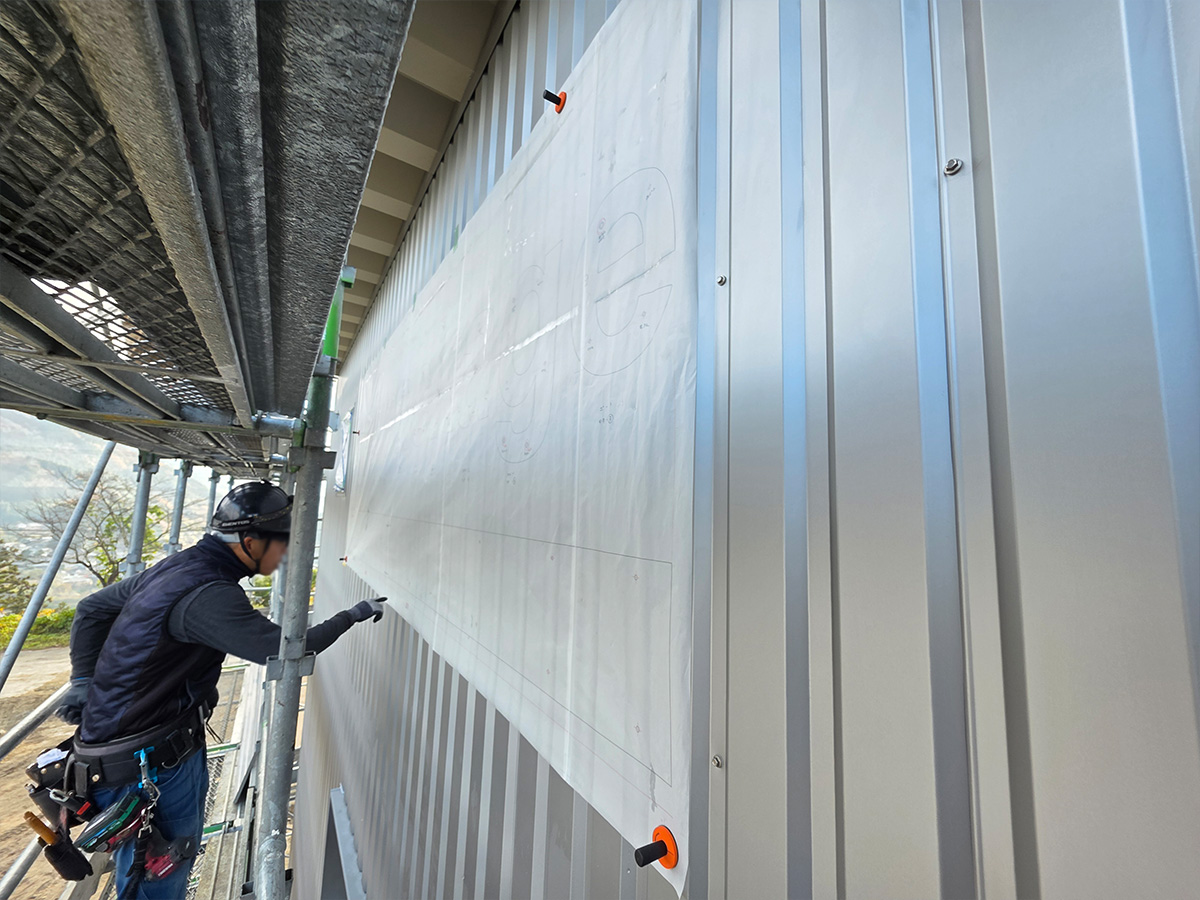角波サイディングの外壁に原稿をセットし、穴開け位置を確認。