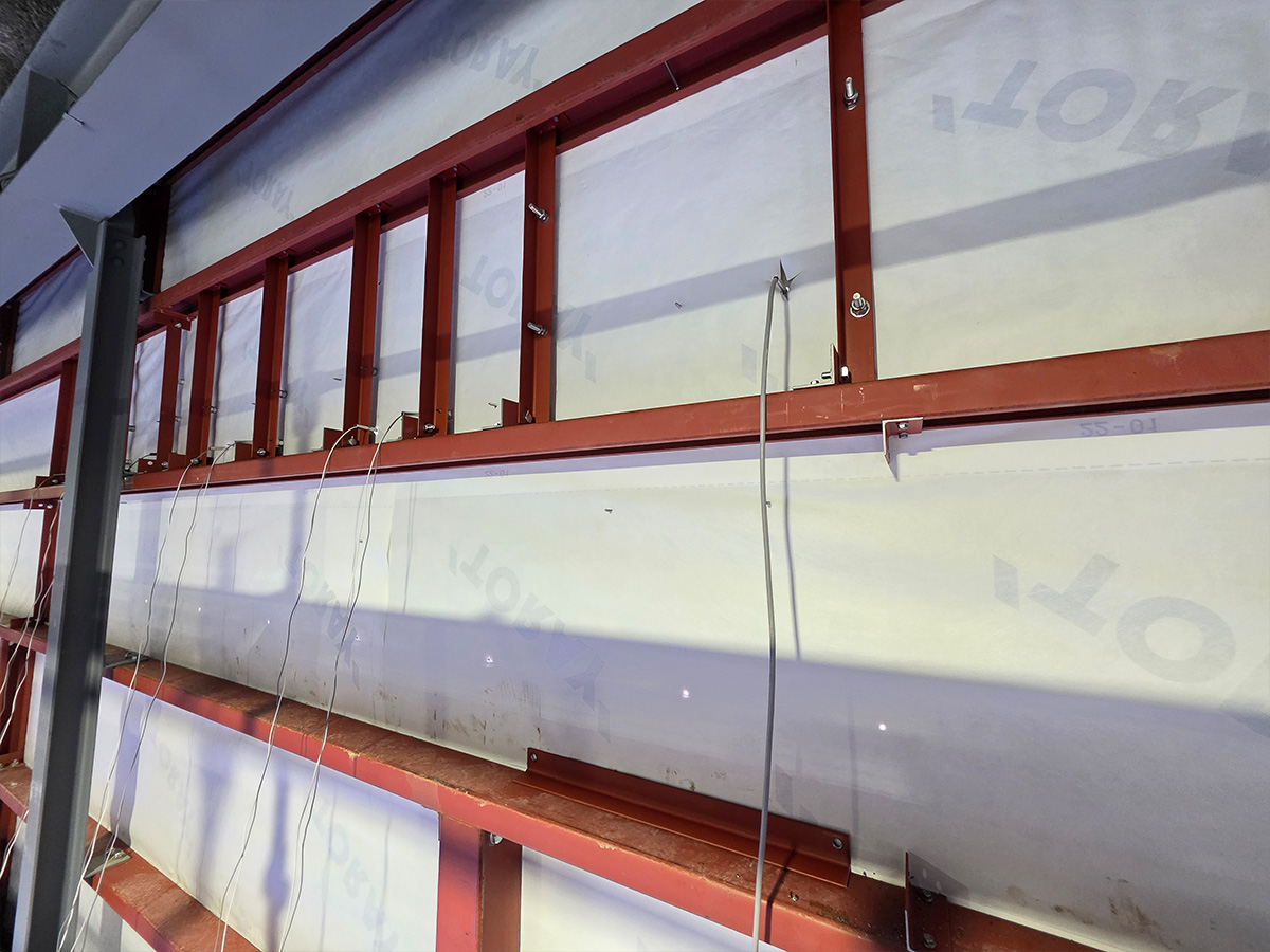 鉄骨がある部分に、壁面固定用のビス穴を開けていきます。
