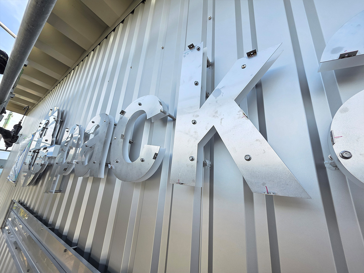 表面にシート貼していますので、照明不点灯時も青い文字でハッキリ社名サインが見えます。