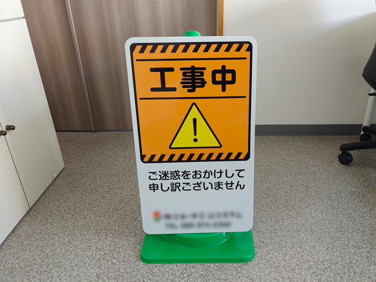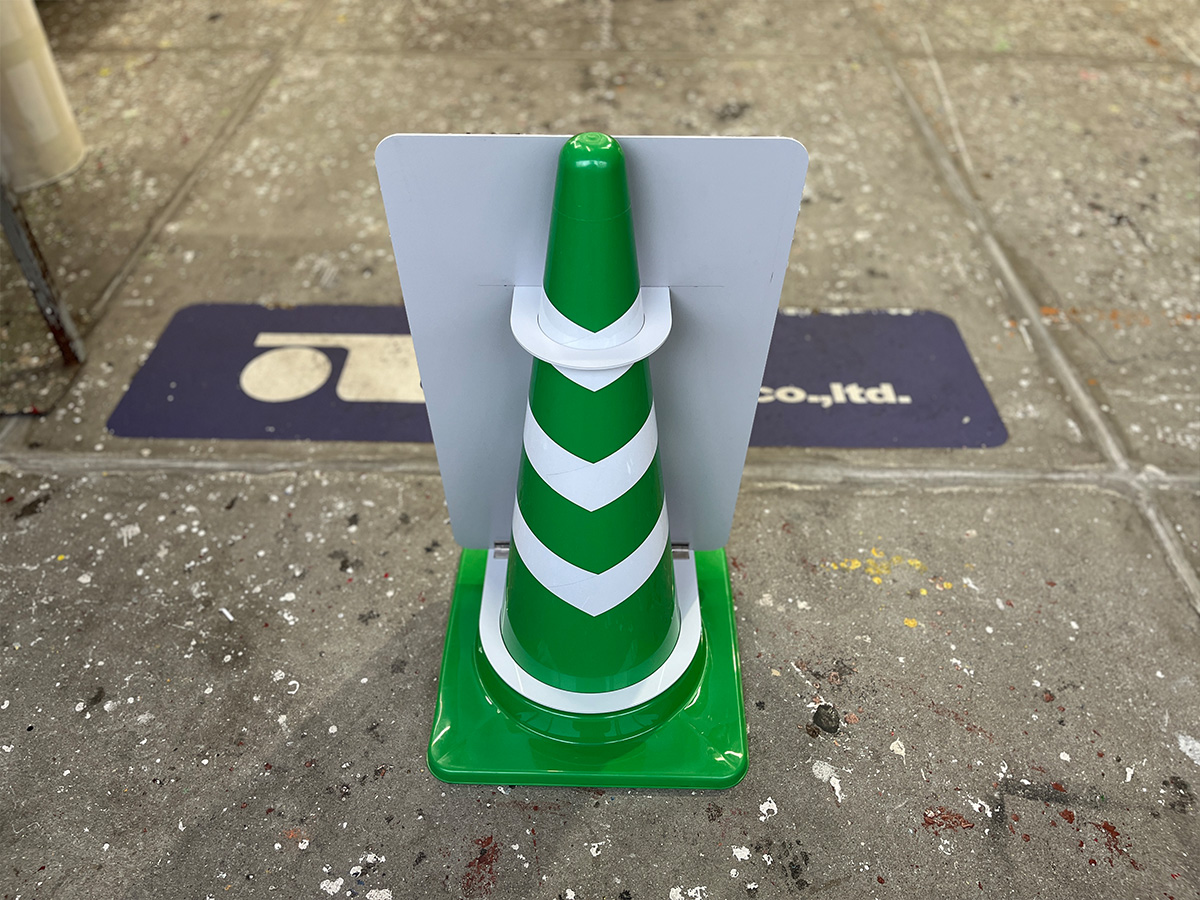 以前、お客様からのご要望で、カラーコーンに簡単に取付が出来るサインを自社にて制作しました。