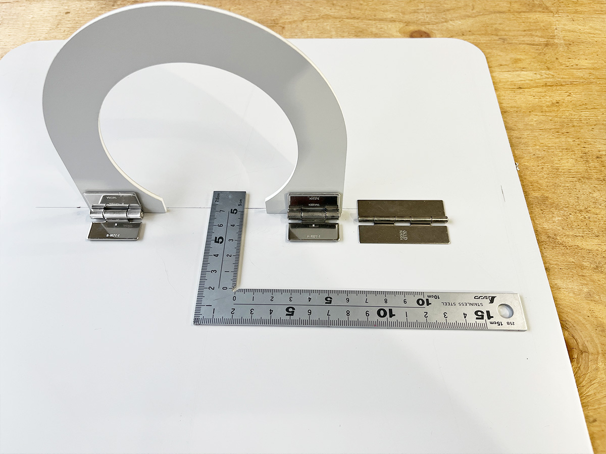 前回制作したものと蝶番の大きさを比較し、蝶番が取付可能な大きさで取付パーツのカタチを検討していきます。